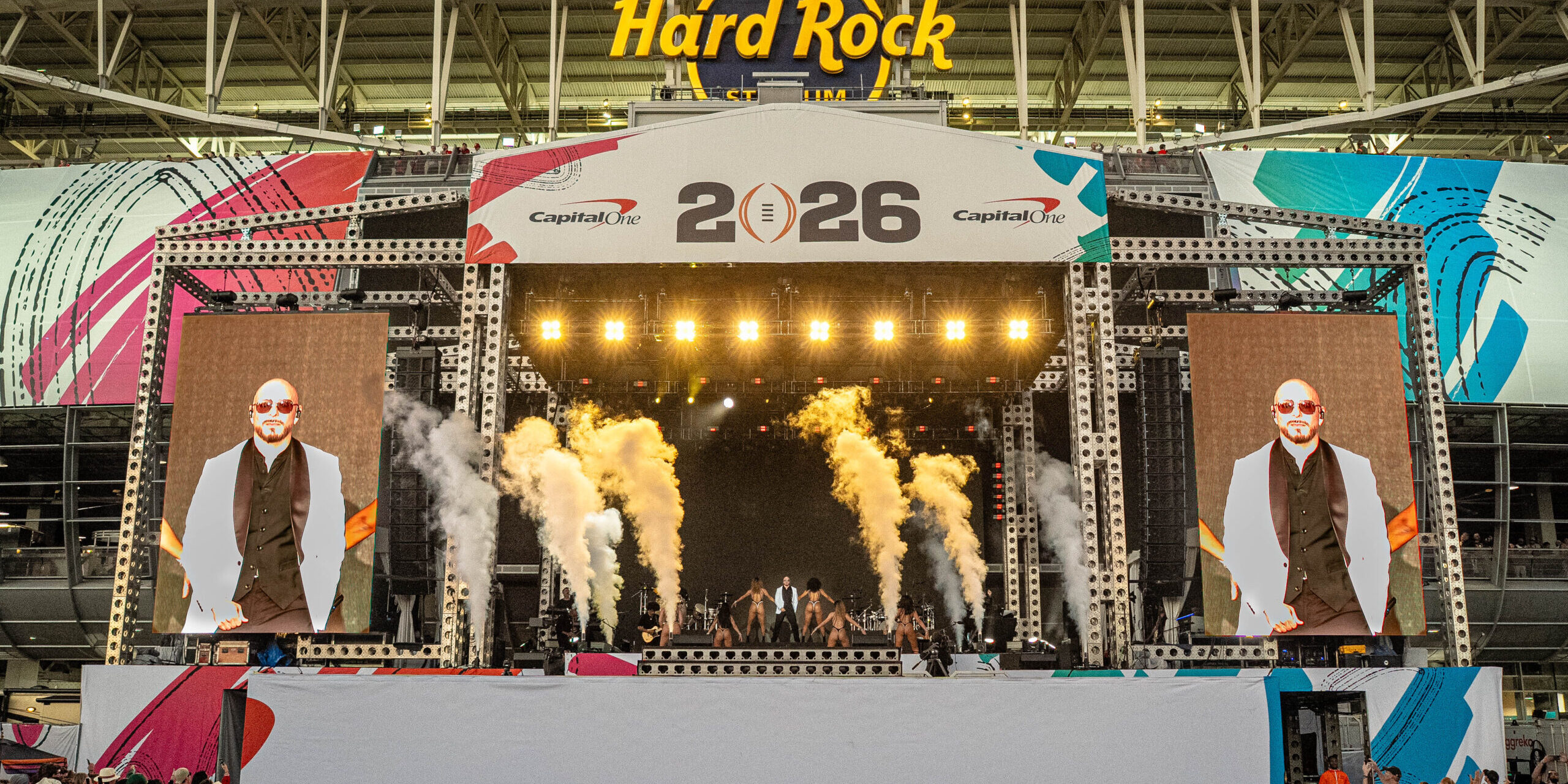 Miami, FL (January 20, 2026) – Global superstar Pitbull (Mr. 305 / Mr. Worldwide) set the tone for the 2026 College Football Playoff National Championship with a high-energy headlining performance at the Capital One Music Stage during the Allstate Championship Tailgate outside Hard Rock Stadium on Monday. Fans packed the Pitbull activation area throughout the day, where thousands of signature bald caps, Pitbull-branded sunglasses, and “I’M BACK” Tour koozies were distributed. Multiple photo-opportunity stations throughout the tent invited fans to pose in their Pitbull merch and capture the moment.